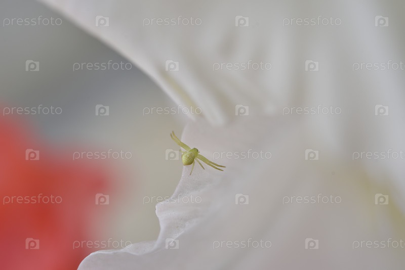 Зеленый маленький паук на розово-белом цветке. Садовый паук летом. Араниелла кукурбитина