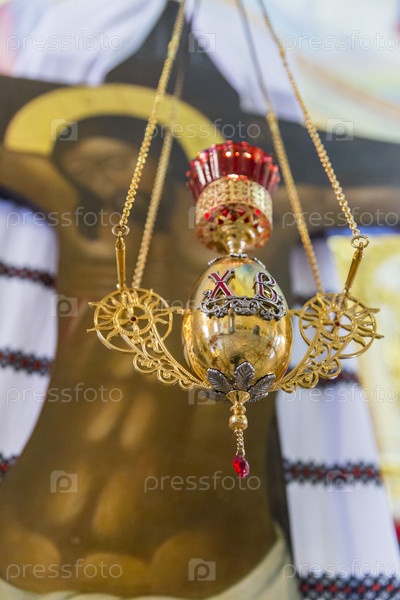 Россия. Санкт-Петербург. Церковная православная атрибутика. Крест и горящие свечи, лампада. Парафералия Православной церкви. Крест с горящими свечами, светильник