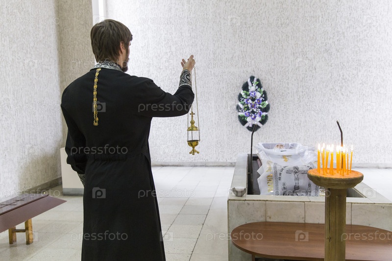 Россия. Санкт-Петербург. Отпевание покойного. Отпевание умершего православным священником в крематории. Прощание на похоронах. Россия. Санкт-Петербург. Похоронная служба погибшего. Погребальная служба умершего, проведенная православным священником в крема