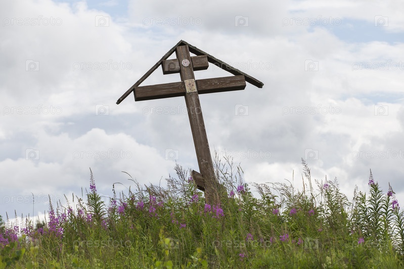 Россия. Новгородская область. Иван-чай. Цветение иван-чая. Православный крест. Православный крест на холме среди травы