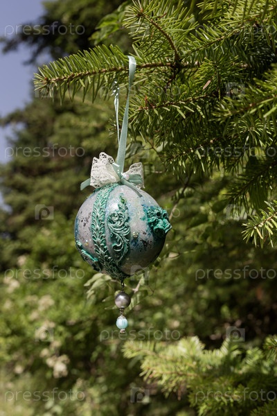 Рождественская или новогодняя игрушка, висящая на еловой ветке крупным планом