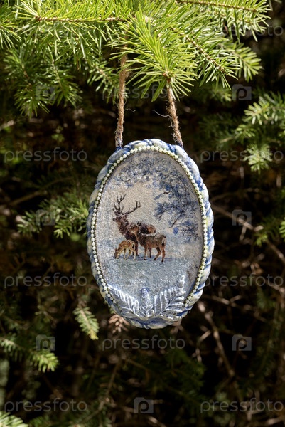 Рождественский или новогодний кулон, висящий на еловой ветке крупным планом
