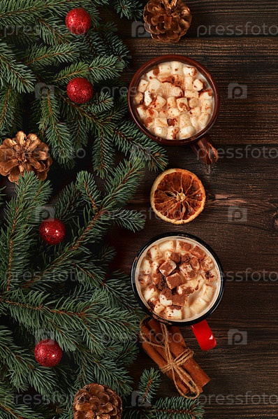 Рождественский алкогольный или безалкогольный шоколадный коктейль с зефиром и корицей, согревающий зимний напиток в холодное время года на деревянном фоне, рождественский праздничный грог, гоголь-моголь, зимняя композиция, избирательный фокус