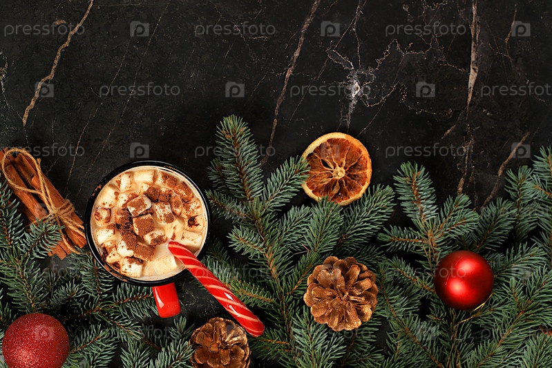 Рождественский алкогольный или безалкогольный шоколадный коктейль с зефиром и корицей, согревающий зимний напиток в холодное время года на бетонном фоне, рождественский праздничный грог, гоголь-моголь, зимняя композиция, избирательный фокус