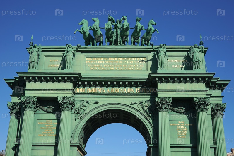 Россия. Санкт-Петербург. Нарвские триумфальные ворота на Стачецкой площади. Колесница, управляемая богиней Славы. Россия. Санкт-Петербург. Нарвская Триумфальная дверь на Ударной площади. Повозка, которую ведет Богиня славы