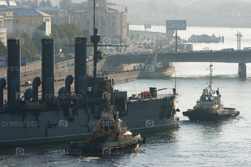 Россия. Санкт-Петербург. Буксировка крейсера Авроры с места стоянки на ремонт. Россия. Санкт-Петербург. Стягивание крейсера Aurora с парковки для ремонта