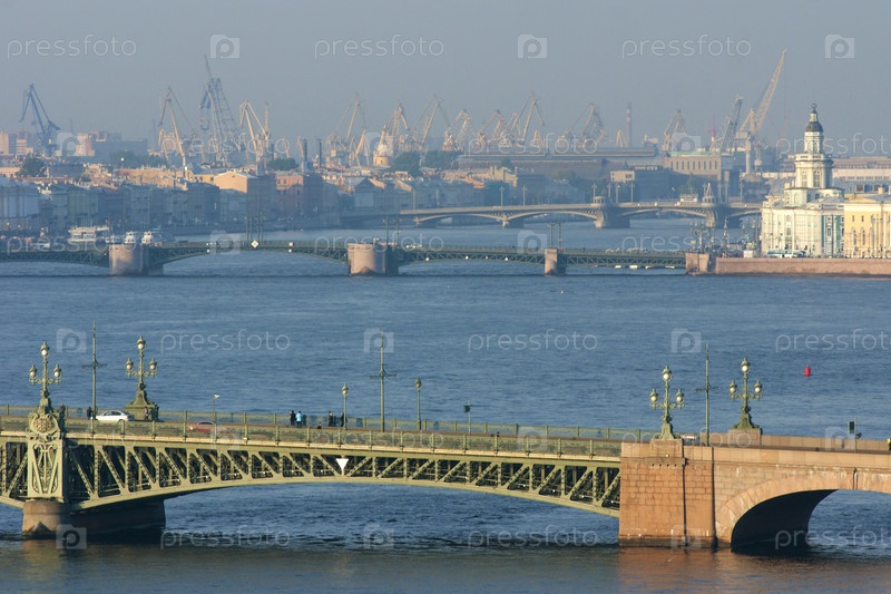 Россия. Санкт-Петербург. Вид на Неву. Троицкий и Дворцовый мосты. Россия. Санкт-Петербург. Вид на реку Неву. Тринити и дворцовые мосты