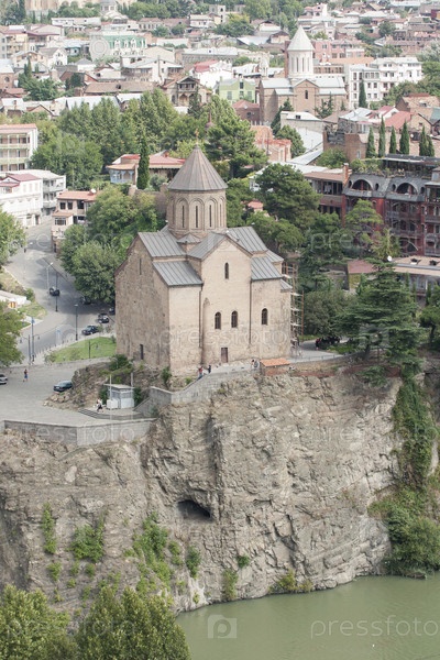 Грузия. Тбилиси. Православные монастыри Тбилиси. Храм Метехи и река Кура. Джорджия. Тбилиси. Православные монастыри Тбилиси. Храм Метеки и река Кура