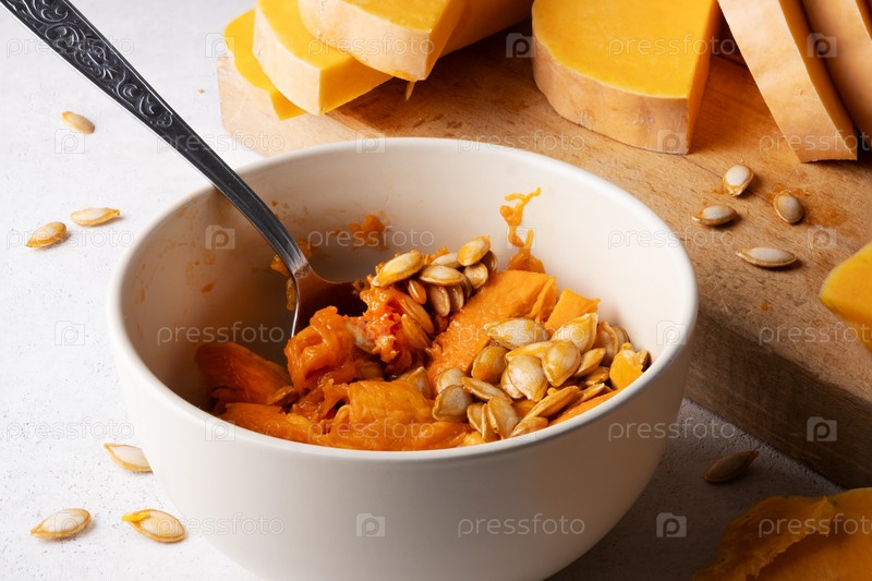 Свежие сырые тыквенные семечки в миске. Нарезка тыквы. Селективный фокус