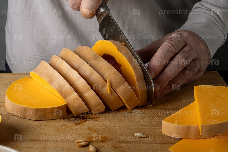 Мужчина режет тыкву на деревянной разделочной доске. Селективный фокус