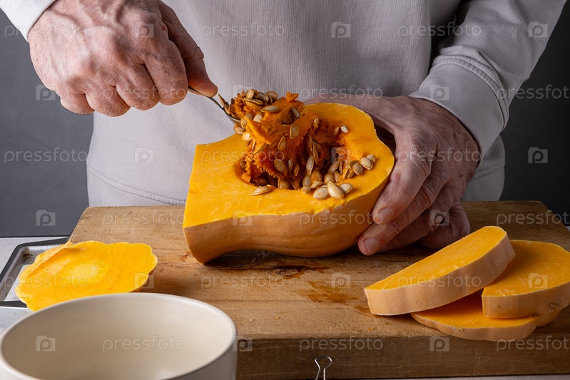 Кавказский мужчина чистит спелую тыкву от семян на кухне