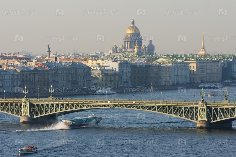 Россия. Санкт-Петербург. Вид на реку Неву. Троицкий мост. Пассажирское речное судно. Россия. Санкт-Петербург. Вид на реку Неву. Мост Тринити. Пассажирское речное судно