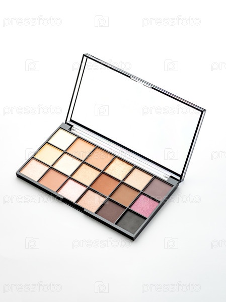Крупным планом красочная палитра теней для век, изолированная на белом фоне. Откройте косметичку. Модные пастельные и яркие цвета для лица