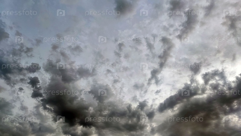 Облачное небо с грозовыми тучами. Низкие кучевые облака различной формы закрывают почти все небо. Они находятся на разной высоте и имеют разные цвета: белый, светло-серый и темно-синий