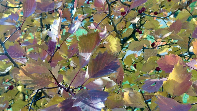 Сибирский баклажан Crataegus sanguinea. На кусте растут цветные круглые листья баклажана. Осеннее солнце освещает листья куста. Они имеют зеленый, красный, желтый и фиолетовый цвета