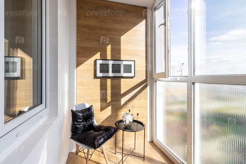 Небольшая лоджия в квартире с уютным креслом и журнальным столиком