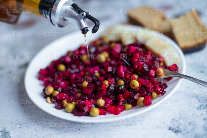 Оливковое масло льется на винегрет