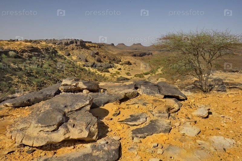 Африка, Мавритания. Знойный пейзаж на скалистом плато природного парка Агрур на юго-западной окраине пустыни Сахара