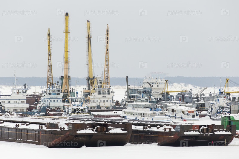 Россия. Чувашская республика, Чебоксары. Виды Чебоксара. Суда в речном порту под снегом. Россия. Чувская Республика, Чебоксары. Типы Чебоксар. Корабли в речной гавани под снегом