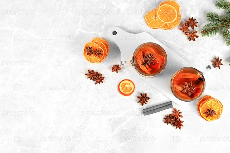 Крепкий алкогольный или безалкогольный коктейль, глинтвейн со специями, анисом, клюквой и корицей, согревающий зимний напиток в холодное время года, рождественский праздничный грог, зимняя композиция,