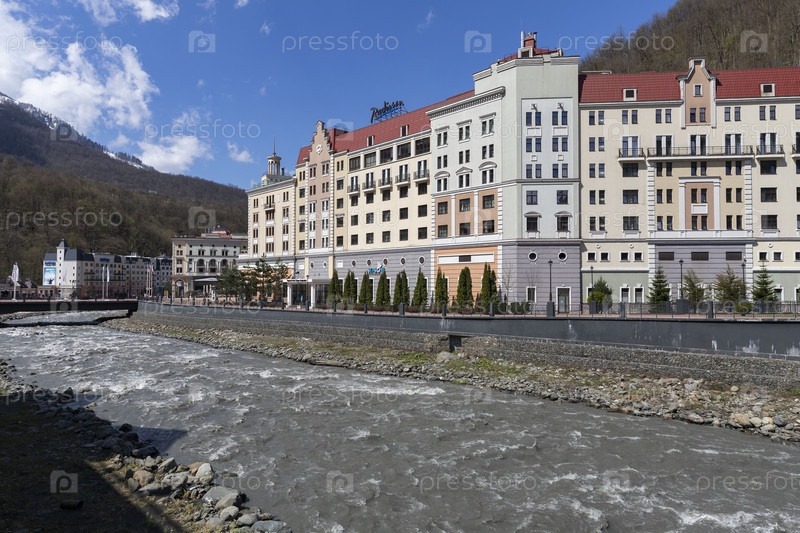 Россия. Сочи. Горнолыжный курорт Роза Хутор на Красной поляне. Отель Radisson на берегу реки Мзымта. Россия. Сочи. Городской горнолыжный комплекс Rosa Khutor на Красной Поляне. The Radisson Hotel is located on the banks of the Mzymta River