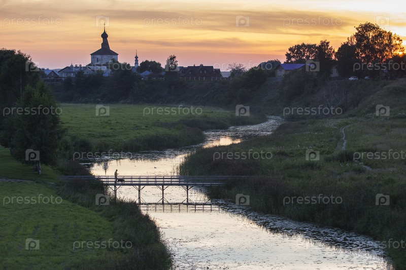 Россия. Суздаль. Виды Суздаля. Река Каменка. Закат. Типы Суздала. Река Каменка. Затмение солнца