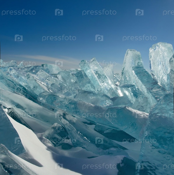 Россия. Восточная Сибирь. Случайные груды льдин, сверкающих на солнце на замерзшем Байкале