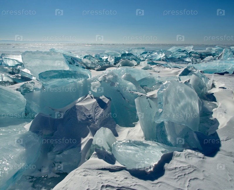 Россия. Восточная Сибирь. Случайные груды льдин, сверкающих на солнце на замерзшем Байкале