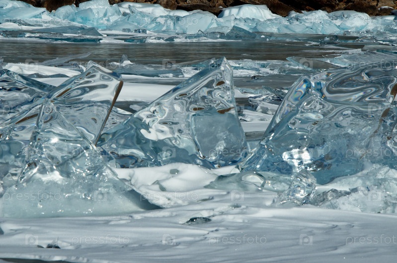 Россия. Восточная Сибирь. Случайные груды льдин, сверкающих на солнце на замерзшем Байкале