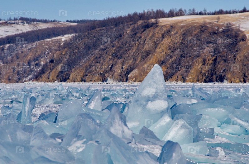 Россия. Восточная Сибирь. Случайные груды льдин, сверкающих на солнце на замерзшем Байкале