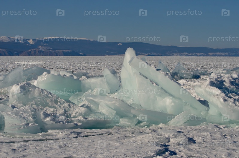 Россия. Восточная Сибирь. Случайные груды льдин, сверкающих на солнце на замерзшем Байкале