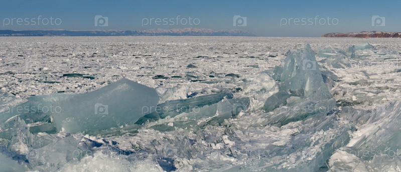 Россия. Восточная Сибирь. Случайные груды льдин, сверкающих на солнце на замерзшем Байкале