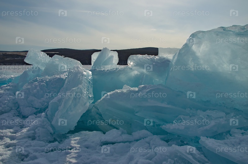 Россия. Восточная Сибирь. Случайные груды льдин, сверкающих на солнце на замерзшем Байкале