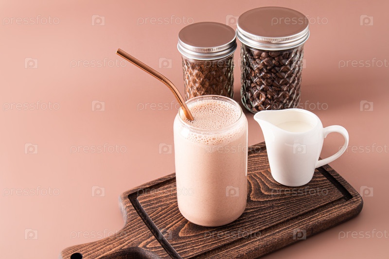Свежеприготовленный молочный коктейль или кофе с молоком в современном стакане в форме пивной банки на деревянной разделочной доске. Передний план