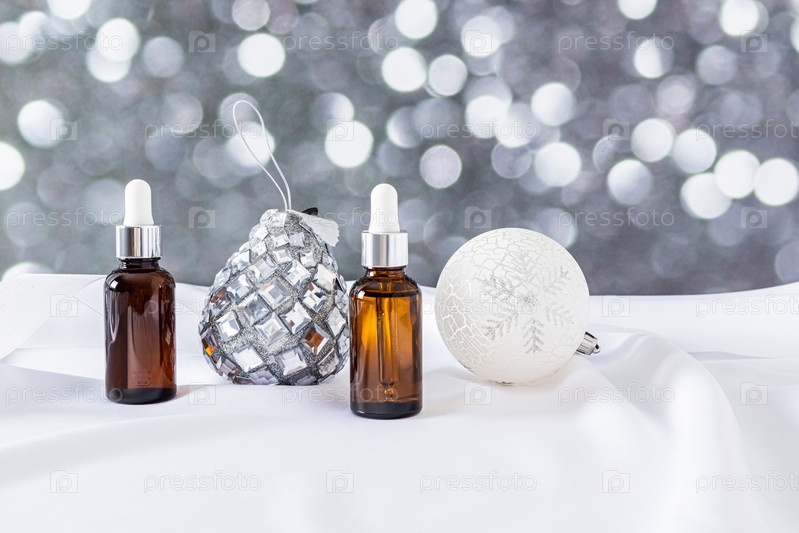 Две косметические бутылочки с капельницей с натуральным средством по уходу за кожей лица на фоне елочных шаров. эффект боке света