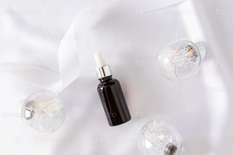 Косметическая бутылочка с капельницей и серебряной крышкой с органическим средством ухода за собой лежит на белом атласе среди новогодних серебряных шариков. Макет