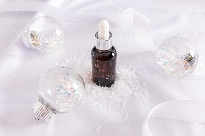 Увлажняющая сыворотка во флаконе с капельницей для ухода за антивозрастной кожей на белом атласе и стеклянных шариках. Реклама продукции к Новому году