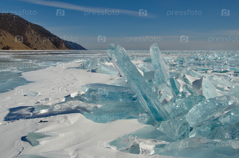 Россия. Восточная Сибирь. Случайные груды льдин, сверкающих на солнце на замерзшем Байкале