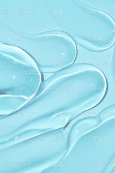 Прозрачные капли косметического геля-сыворотки. Жидкая текстура с пузырьками на синем фоне. Средства по уходу за кожей, натуральная косметика. Концепция красоты по уходу за лицом и телом