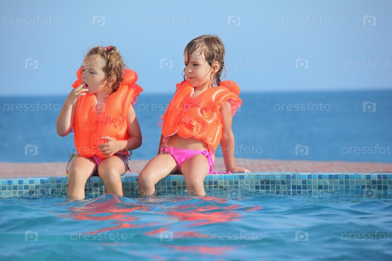 Две маленькие девочки в спасательных жилетах сидят на краю бассейна на курорте