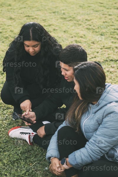 Три человека латиноамериканского происхождения сидят на зеленой траве парка со смарт-устройством. расслабленно и комфортно, когда они развлекаются перед экранами, просматривают социальные сети, одеты в повседневную одежду, и их лица говорят об удовлетворе