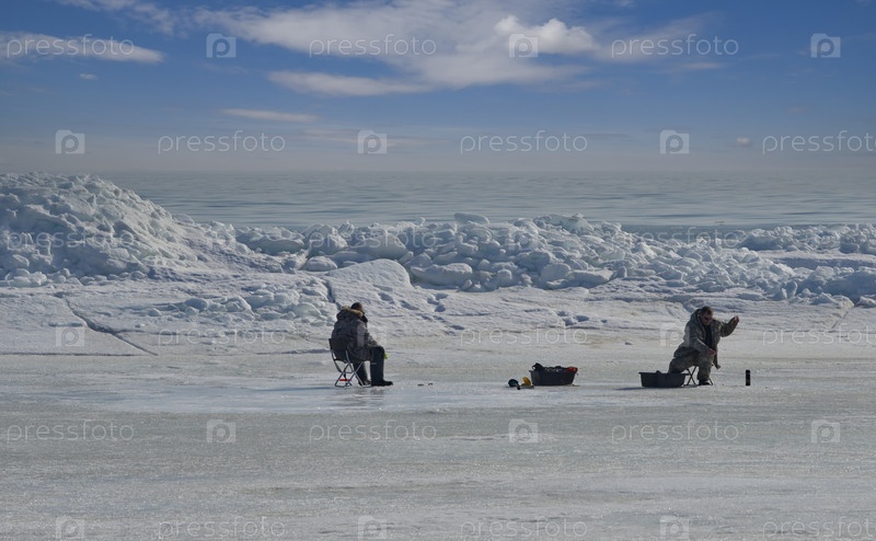 Взморье. Россия. 22 марта 2023 года. Любители подледной рыбалки ловят рыбу на последнем весеннем льду западного побережья Тихого океана на острове Сахалин