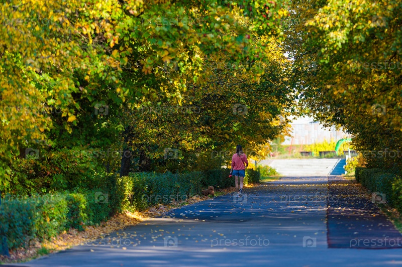 Женщина выгуливает собаку по тротуару в городском парке в солнечный день