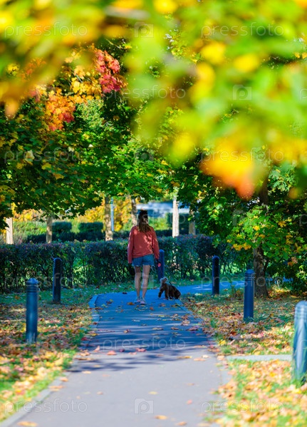 Женщина выгуливает собаку по тротуару в городском парке в солнечный день