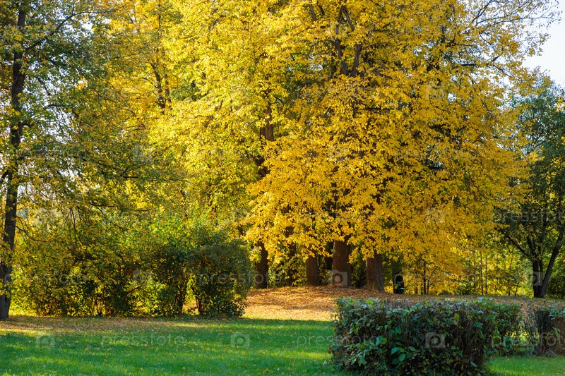 Осенний пейзаж городского парка, красивый вид на пестрые листья