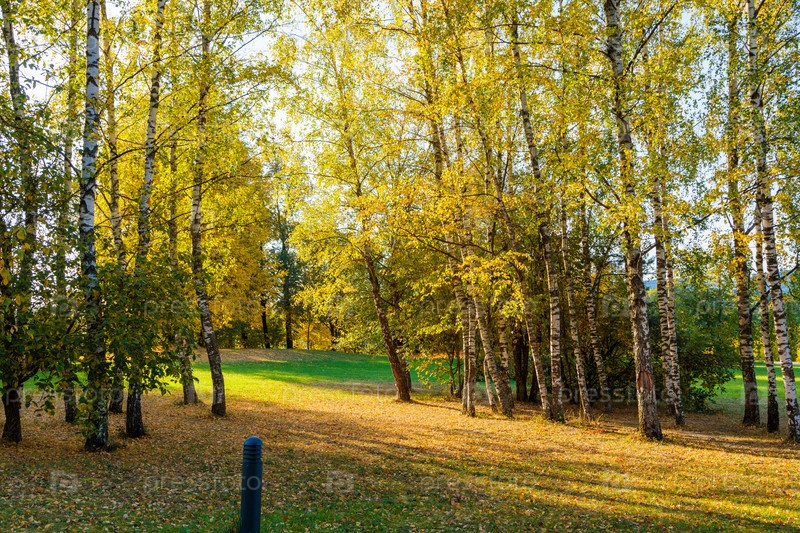 Осенний пейзаж городского парка, красивый вид на пестрые листья