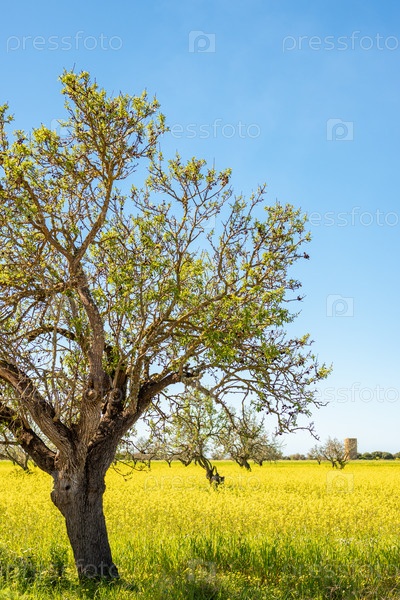 Вертикальный вид на миндальное дерево, на лугу, полном желтых цветов, на фоне голубого неба, свободного от облаков, на Майорке, Балеарские острова, Испания