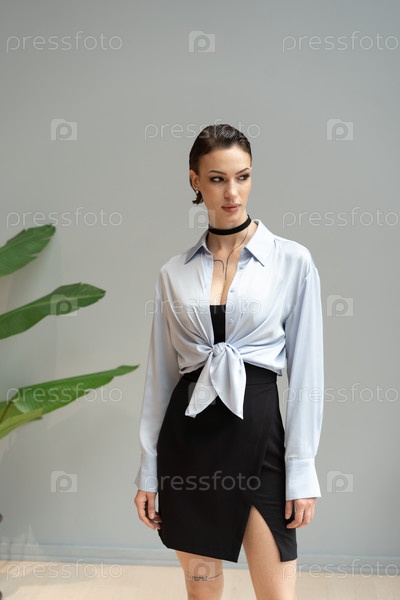 Молодая красивая женщина позирует в синей рубашке в студии