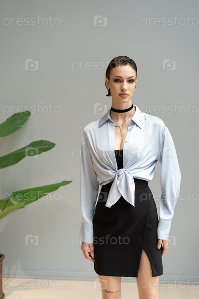 Молодая красивая женщина позирует в синей рубашке в студии