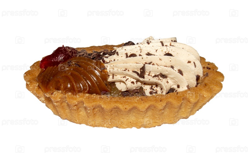 Корзина с кремом на белом фоне.Торт со смесью и шоколадным сливком.Картина со сметаной и шоколадовыми чипсами